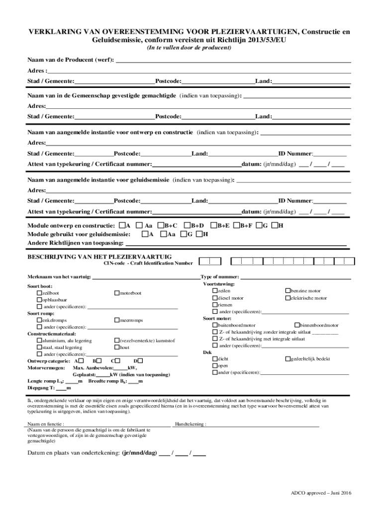 DECLARING VAN OVEREENSTEMMING POOR PLEZIERVAARTUIGEN, Constructive en Geluidsemissie, conform variate UIT Richelieu 2013/53/EU (In the Cullen door DE produced) Nam van de Produced (were): Acres :