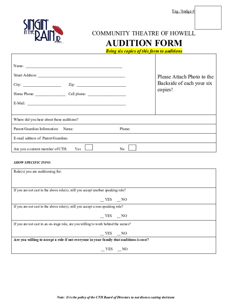 Tag / badge #COMMUNITY Theater OF HOWELLAUDITION FORM Bring six copies of this form to auditions Name: ___ Street Address: ___ City: ___Zip: ___Home Phone: ___ Cell phone: ___Please Attach Photo to