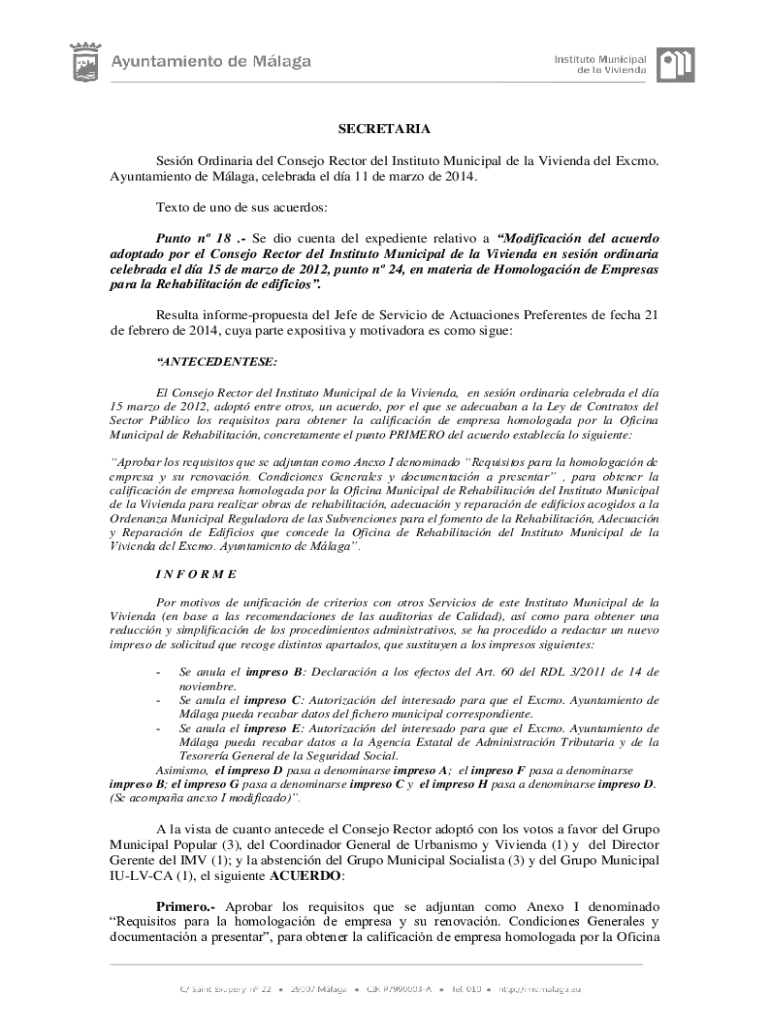 SECRETARIAT Resin Ordinary Del Consent Rector Del Institute Municipal de la Vivienne Del Exam. Ayuntamiento de Mlaga, celebrate El the 11 de Mario de 2014. Text ode UNO de SUS accords: Punt n 18.