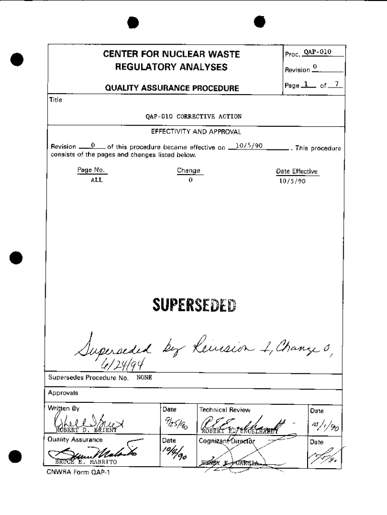 6 CENTER FOR NUCLEAR WASTE REGULATORY ANALYSESProc. QAPO1O Revision__QUALITY ASSURANCE PROCEDURE Page 1of7Title QAPO10 CORRECTIVE ACTIONEFFECTIVITY AND APPROVAL Revision 0 of this procedure became