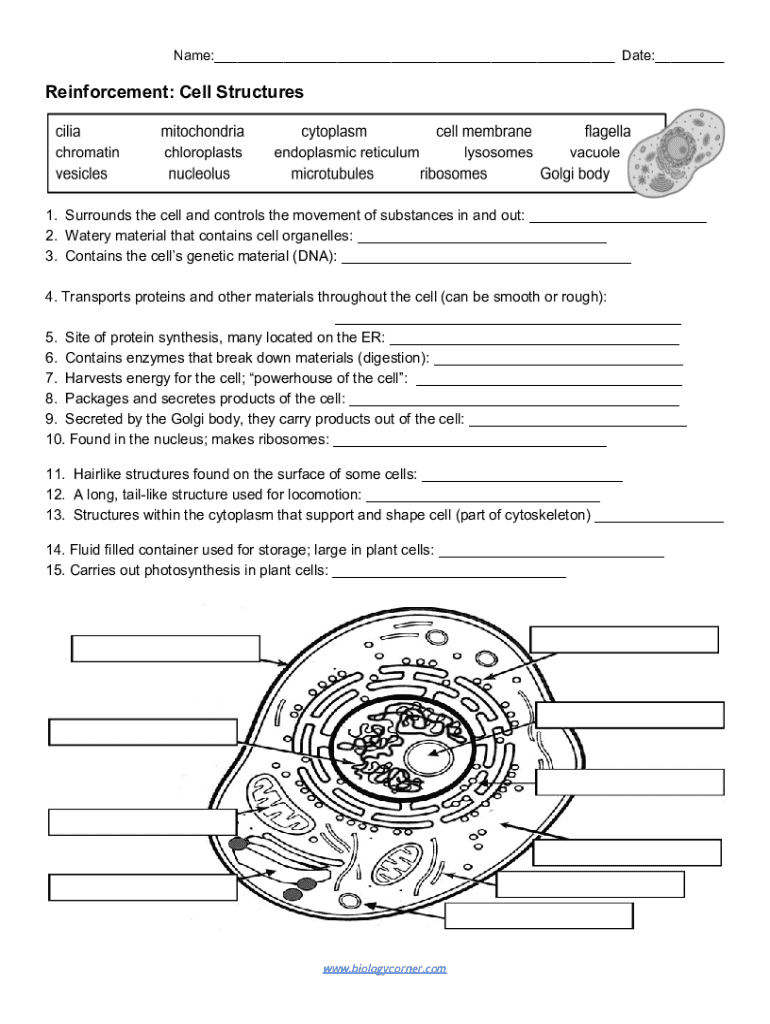 Name:___ Date:___Reinforcement: Cell Structures1. Surrounds the cell and controls the movement of substances in and out: ___ 2. Watery material that contains cell organelles: ___ 3. Contains the cells