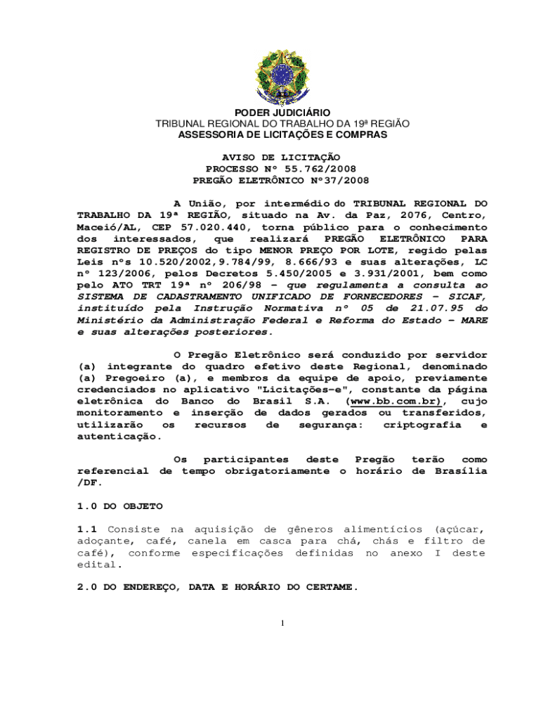 POWER JUDICIAL TRIBUNAL REGIONAL DO TRIBAL DA 19 REGION ASSESSOR IA DE LICIT AES E COMPRASAVISO DE LICIT AO PROCESS N 55.762/2008 PRESO ELECTRIC N37/2008 A Unit, POR intermix do TRIBUNAL REGIONAL