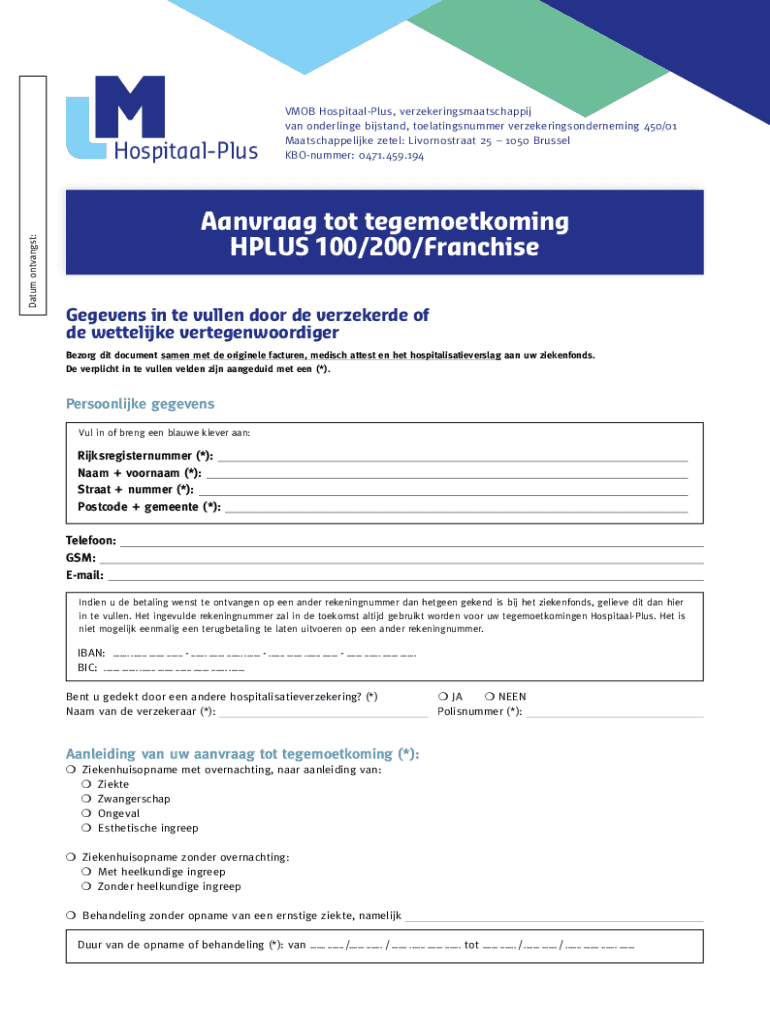 Pak de gratis Aanvraag tot tegemoetkoming HPLUS 100/200/Franchise