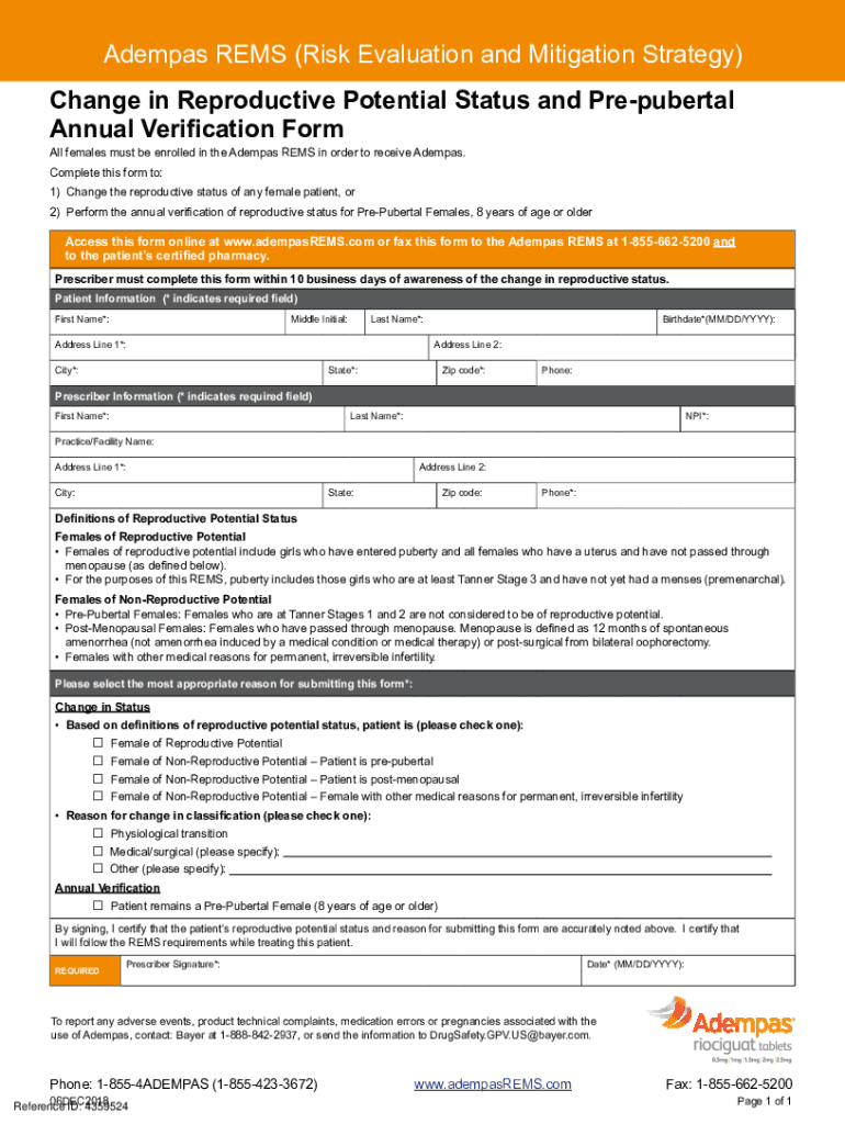 Edemas REMS (Risk Evaluation and Mitigation Strategy) Change in Reproductive Potential Status and Prepubertal Annual Verification Form All females must be enrolled in the Edemas REMS in order to receive