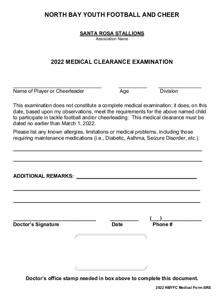 NORTH BAY YOUTH FOOTBALL AND CHEER SANTA ROSA STALLIONS Association Name2022 MEDICAL CLEARANCE EXAMINATION___ Name of Player or Cheerleader___ Age___ Divisions examination does not constitute a complete
