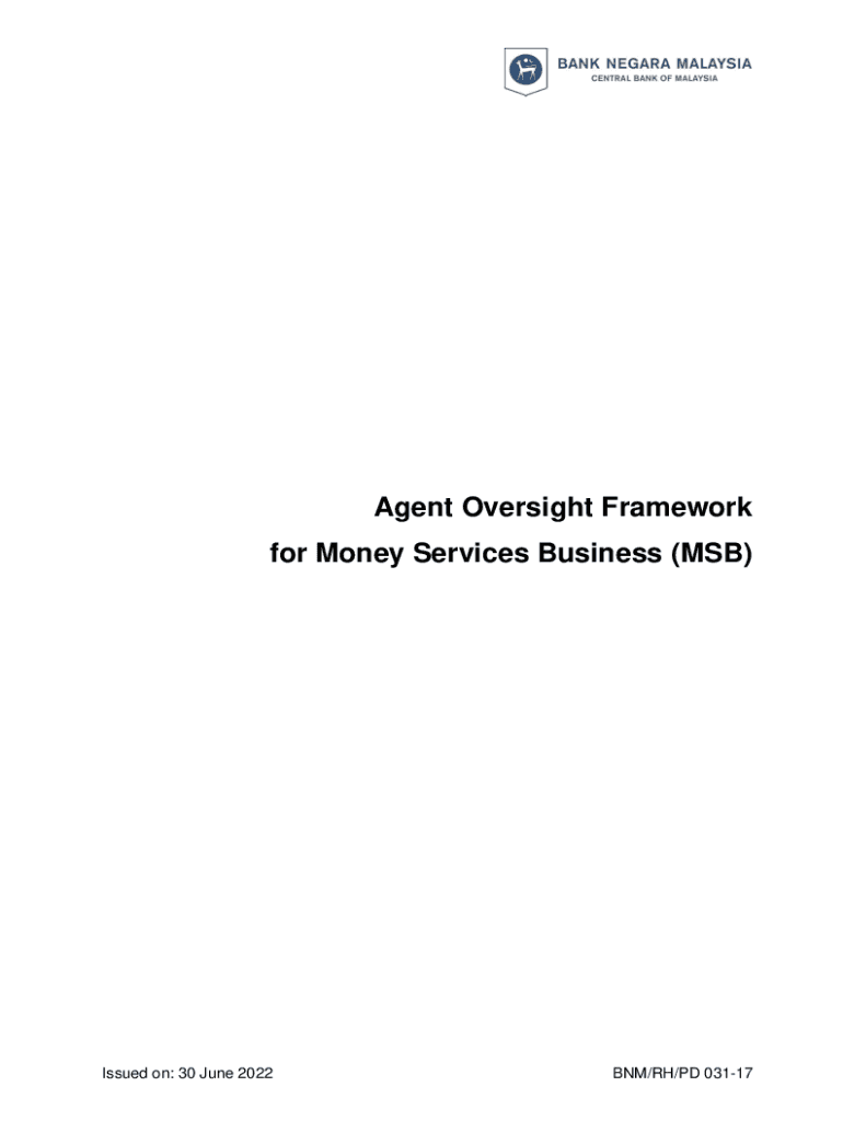 Agent Oversight Framework for Money Services Business (MSB)Issued on: 30 June 2022BNM/RH/PD 03117Agent Oversight Framework for SUBPART A: OVERVIEW 1. Introduction ...........12. Legal Provisions ............23.