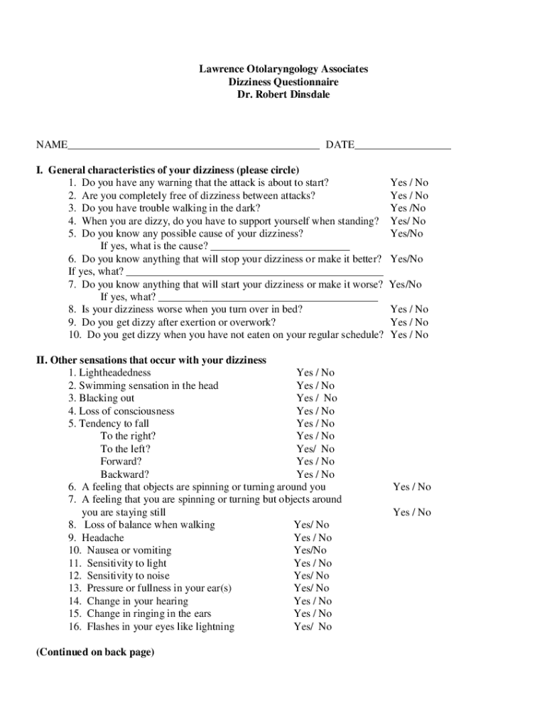 Lawrence Otolaryngology Associates Dizziness Questionnaire Dr. Robert DinsdaleNAME___ DATE___ I. General characteristics of your dizziness (please circle) 1. Do you have any warning that the attack
