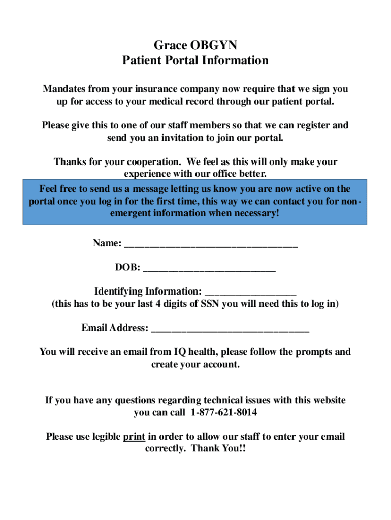 Grace ORGAN Patient Portal Information Mandates from your insurance company now require that we sign you up for access to your medical record through our patient portal. Please give this to one of