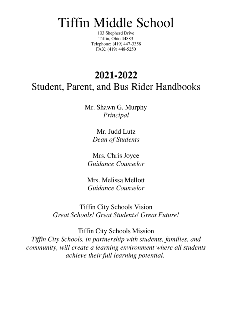 Tiffing Middle School 103 Shepherd Drive Tiffing, Ohio 44883 Telephone: (419) 4473358 FAX: (419) 448525020212022 Student, Parent, and Bus Rider Handbooks Mr. Shawn G. Murphy Principal Mr. Judd Lutz