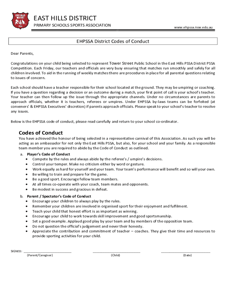 EAST HILLS DISTRICTPRIMARY SCHOOLS SPORTS Association.EFPSA.NSW.edu.auEHPSSA District Codes of Conduct