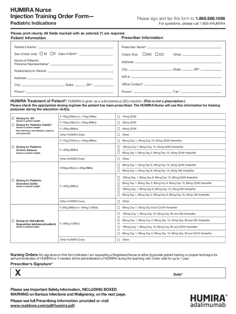 HUM IRA Nurse Injection Training Order Formulas sign and fax this form to 1.866.980.1066Pediatric Indications questions, please call 1.800.4HUMIRAPlease print clearly. All fields marked with an asterisk