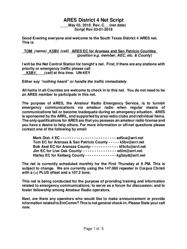ARES District 4 Net Script ___May 03, 2018_Rev. C__ (net date) Script Rev 03012018 Good Evening everyone and welcome to the South Texas District 4 ARES net. This is _TOM_(name) _K5BV (call) _ARES