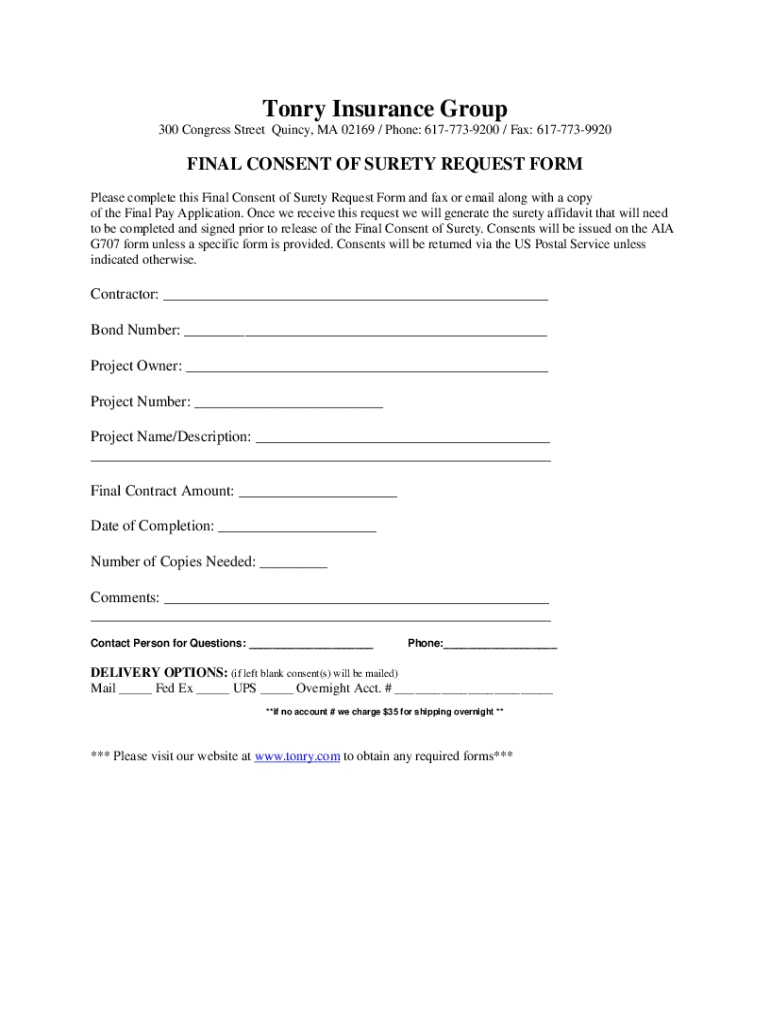 Tony Insurance Group 300 Congress Street Quincy, MA 02169 / Phone: 6177739200 / Fax: 6177739920FINAL CONSENT OF SURETY REQUEST FORM Please complete this Final Consent of Surety Request Form and fax