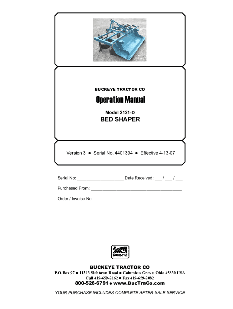 BUCKEYE TRACTOR CO!\”#$%&\'() *%)+%, Model 2121DBED Perversion 3 z Serial No. 4401394 z Effective 41307Serial No: ___ Date Received: ___ / ___ / ___ Purchased From: ___ Order / Invoice No: ___BUCKEYE