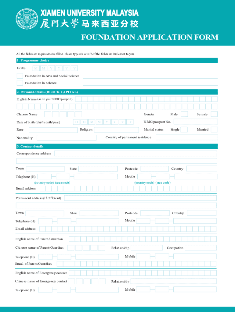 FOUNDATION APPLICATION FORM All the fields are required to be filled. Please type n/a or N/A if the fields are irrelevant to you. 1. Program choice IntakeMMYYYYFoundation in Arts and Social Science