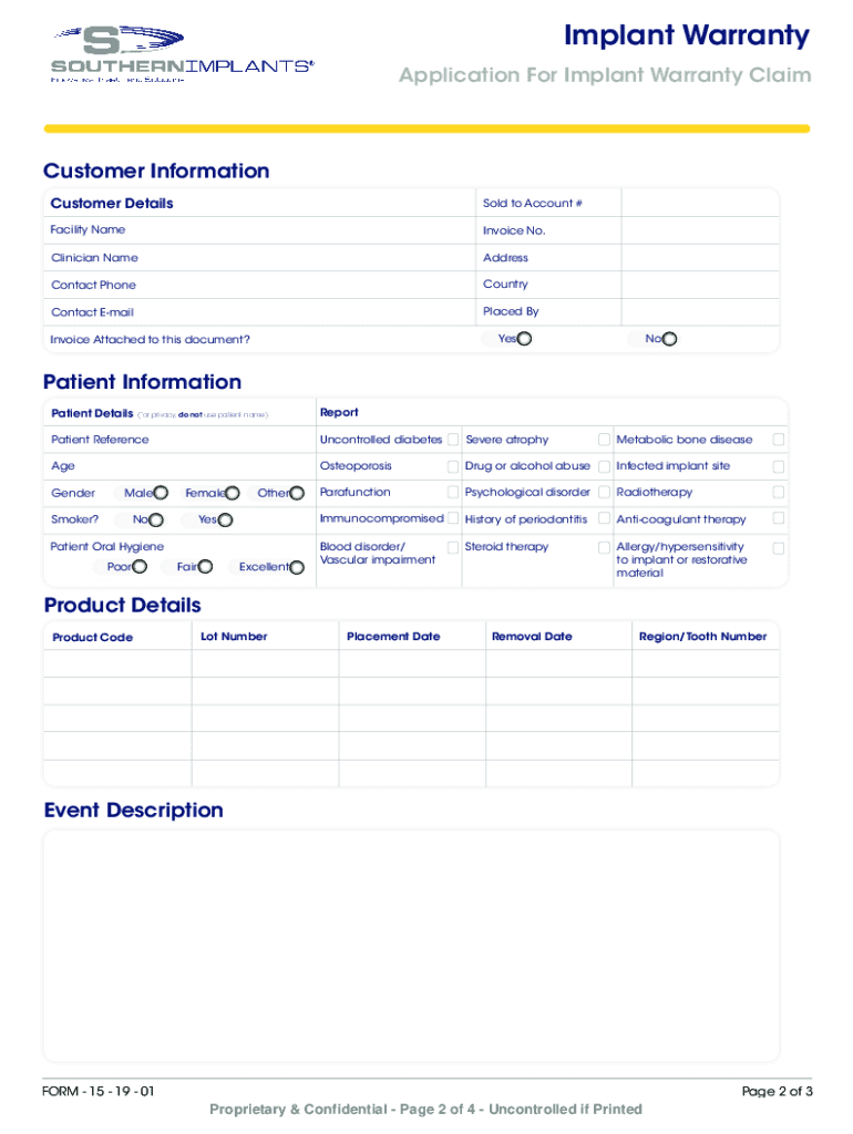 Get the free FORM - 15 - 19 - 01 Implant Warranty Form - Exports