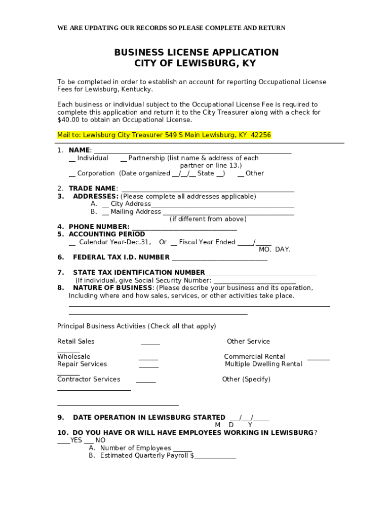 The business license application city of lewisburg, ky is a fillable form in MS Word extension that has to be filled-out and signed for specified purposes. In that case, it is provided to the actual addressee in order to provide some info of certain kinds. The completion and signing is able in hard copy or with a suitable solution e. g. PDFfiller. Such applications help to fill out any PDF or Word file without printing them out. It also lets you customize its appearance according to your requirements and put a legal e-signature. Once finished, the user sends the business license application city of lewisburg, ky to the recipient or several of them by email and even fax. PDFfiller includes a feature and options that make your Word template printable. It offers a number of settings when printing out appearance. No matter, how you will distribute a form - in hard copy or by email - it will always look well-designed and firm. In order not to create a new file from scratch again and again, turn the original document into a template. After that, you will have a rewritable sample.