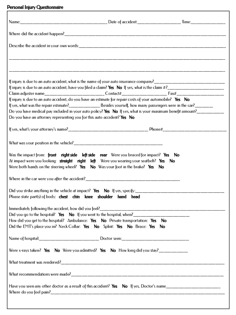 Personal Injury Questionnaire Name:___ Date of accident:___ Time:___ Where did the accident happen?___ Describe the accident in your own words:___ ___ ___ If injury is due to an auto accident, what