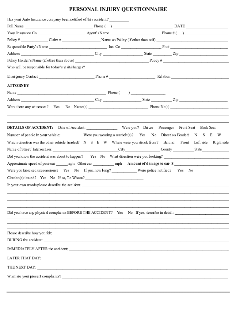 PERSONAL INJURY QUESTIONNAIRE Has your Auto Insurance company been notified of this accident? ___ Full Name ___ Phone () ___ DATE ___Your Insurance Co. ___ Agents Name ___Phone # (___)___ Policy #