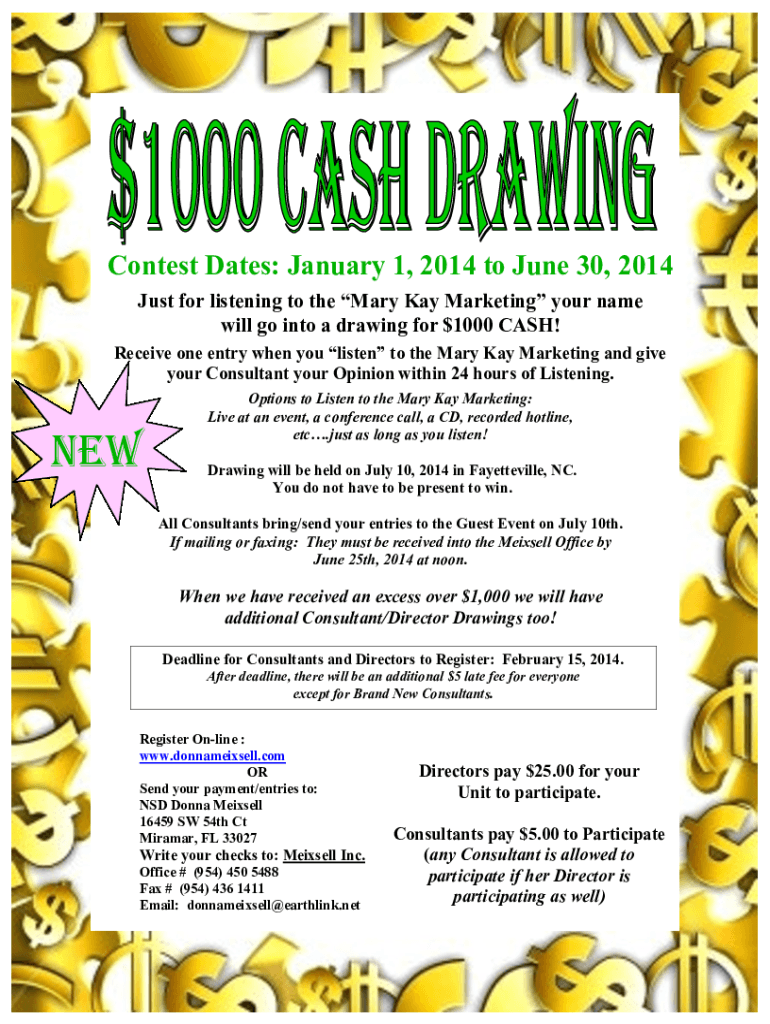 Contest Dates: January 1, 2014, to June 30, 2014, Just for listening to the Mary Kay Marketing your name will go into a drawing for $1000 CASH! Receive one entry when you listen to the Mary Kay Marketing