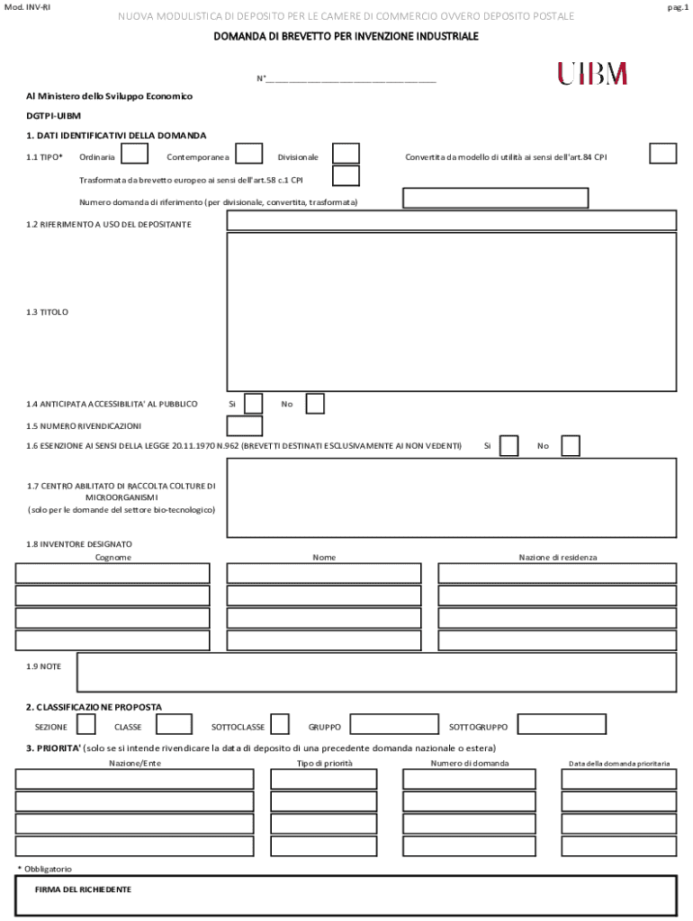 Mod. INVRINUOVA MORALISTIC DI DEPOSITS PER LE CAMERA DI COMMERCIAL OVV ERO DEPOSITS POSTALEpag.1DOMANDA DI BREVE TTO PER INVENTION INDUSTRIALEN___Al Minister hello Filippo Economic DGTPIUIBM 1. DATA