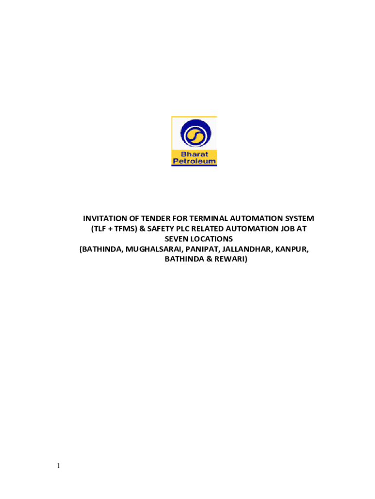INVITATION OF TENDER FOR TERMINAL AUTOMATION SYSTEM (TLF + TFS) & SAFETY PLC RELATED AUTOMATION JOB AT SEVEN LOCATIONS (BATHING, MUGHALSARAI, ANIMAL, JALANDHAR, KANPUR, BATHING & REWARD)1Bharat Petroleum