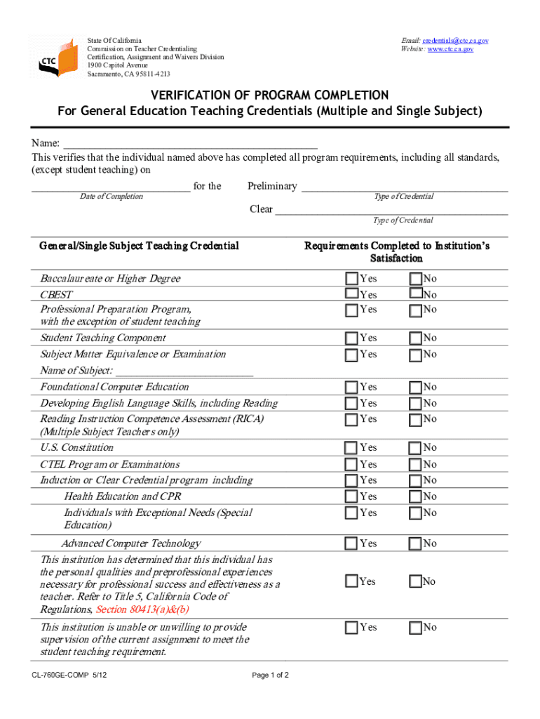Get the free Verification Of Program Completion For General Education Teaching Credentials (Multi...