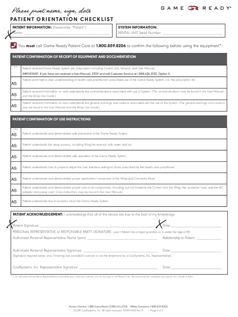 PAT I E N T O R I E N TAT I O N C H E C K L I S T PATIENT INFORMATION: (hereinafter Patient) Name: ___SYSTEM INFORMATION: RENTAL UNIT Serial Number: ___! You must call Game Ready Patient Care at 1.800.859.8206