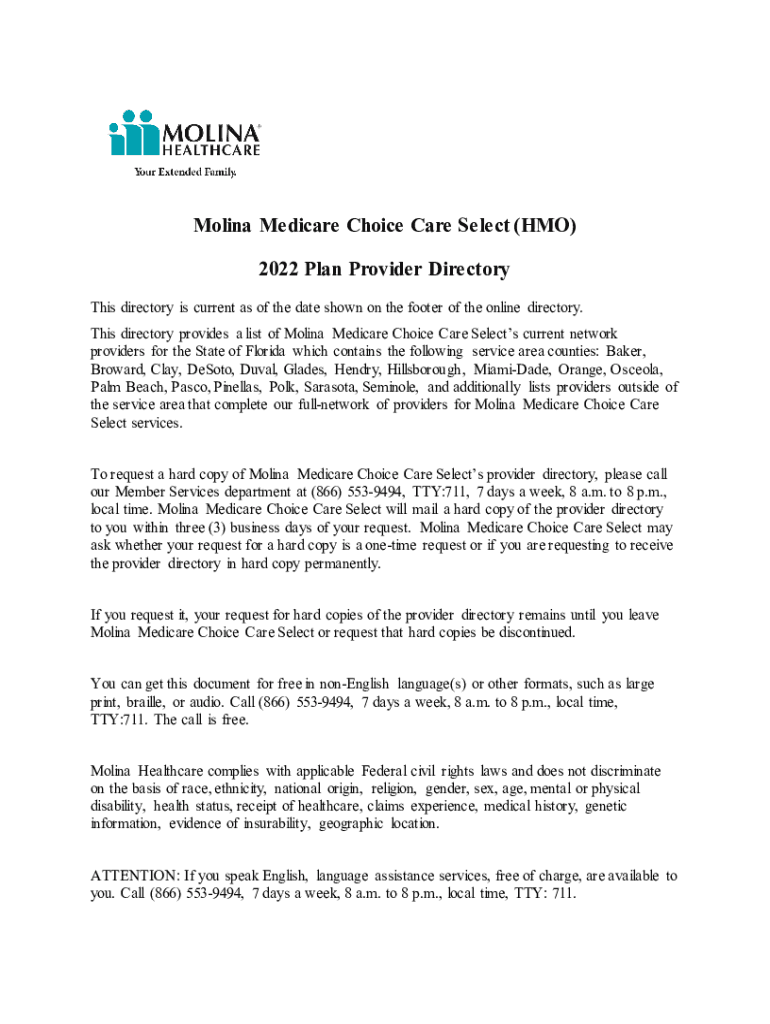 Molina Medicare Choice Care Select (HMO) 2022 Plan Provider Directory This directory is current as of the date shown on the footer of the online directory. This directory provides a list of Molina