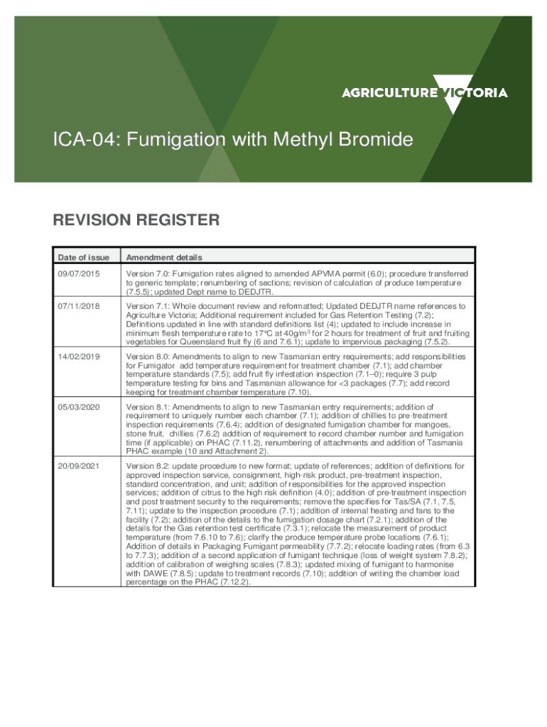 ICA04: Fumigation with Methyl BromideREVISION REGISTER Date of issueAmendment details09/07/2015Version 7.0: Fumigation rates aligned to amended AP VMA permit (6.0); procedure transferred to generic
