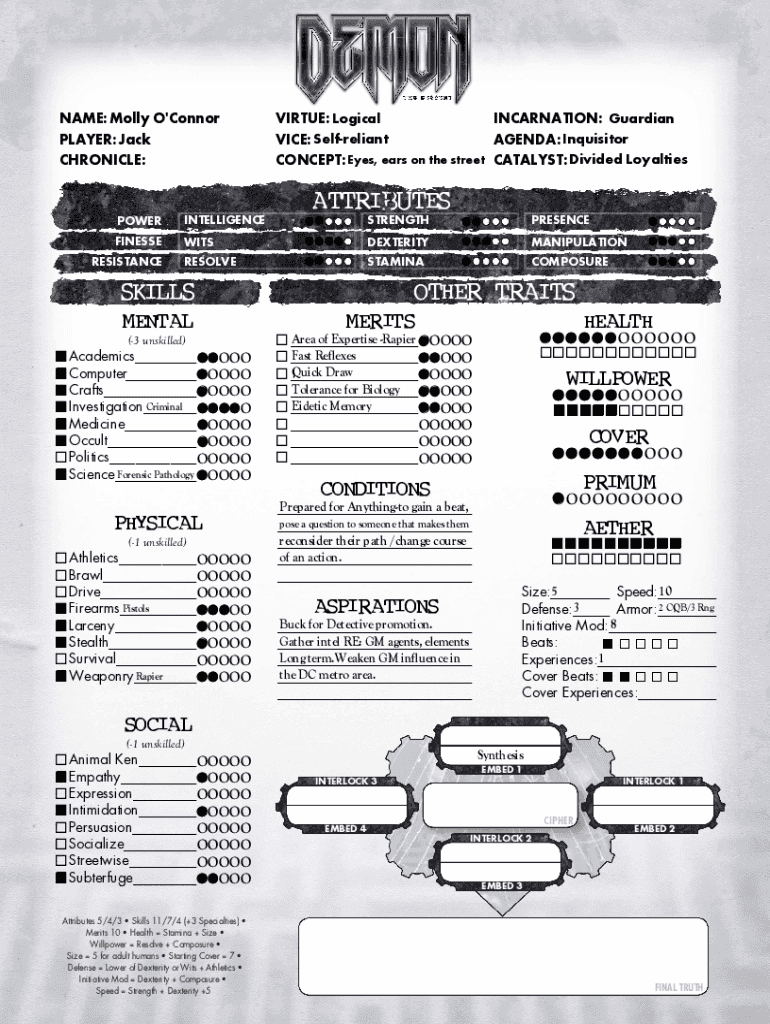 NAME:NAME: Molly O\'Connor PLAYER: Jack CHRONICLE:VIRTUE: Logical INCARNATION: Guardian AGENDA: Inquisitor VICE: Self reliant CONCEPT: Eyes, ears on the street CATALYST: Divided LoyaltiesATTRIBUTESPOWERINTELLIGENCESTRENGTHPRESENCEFINESSEWITSDEXTERITYMANIPULATION