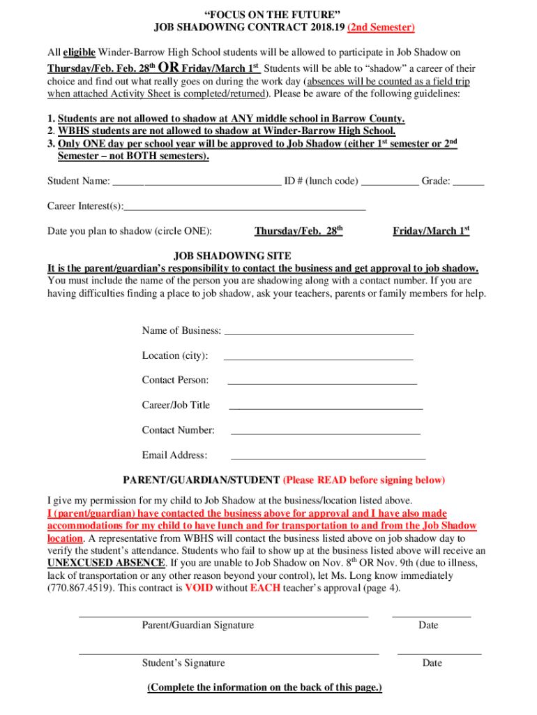 FOCUS ON THE FUTURE JOB SHADOWING CONTRACT 2018.19 (2nd Semester) All eligible WinderBarrow High School students will be allowed to participate in Job Shadow on Thursday/Feb. Feb. 28th OR Friday/March