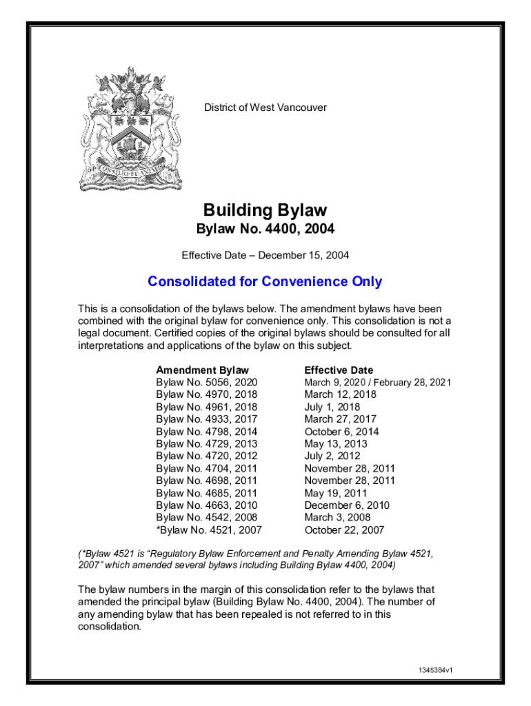 District of West VancouverBuilding Bylaw No. 4400, 2004 Effective Date December 15, 2004Consolidated for Convenience Only This is a consolidation of the bylaws below. The amendment bylaws have been