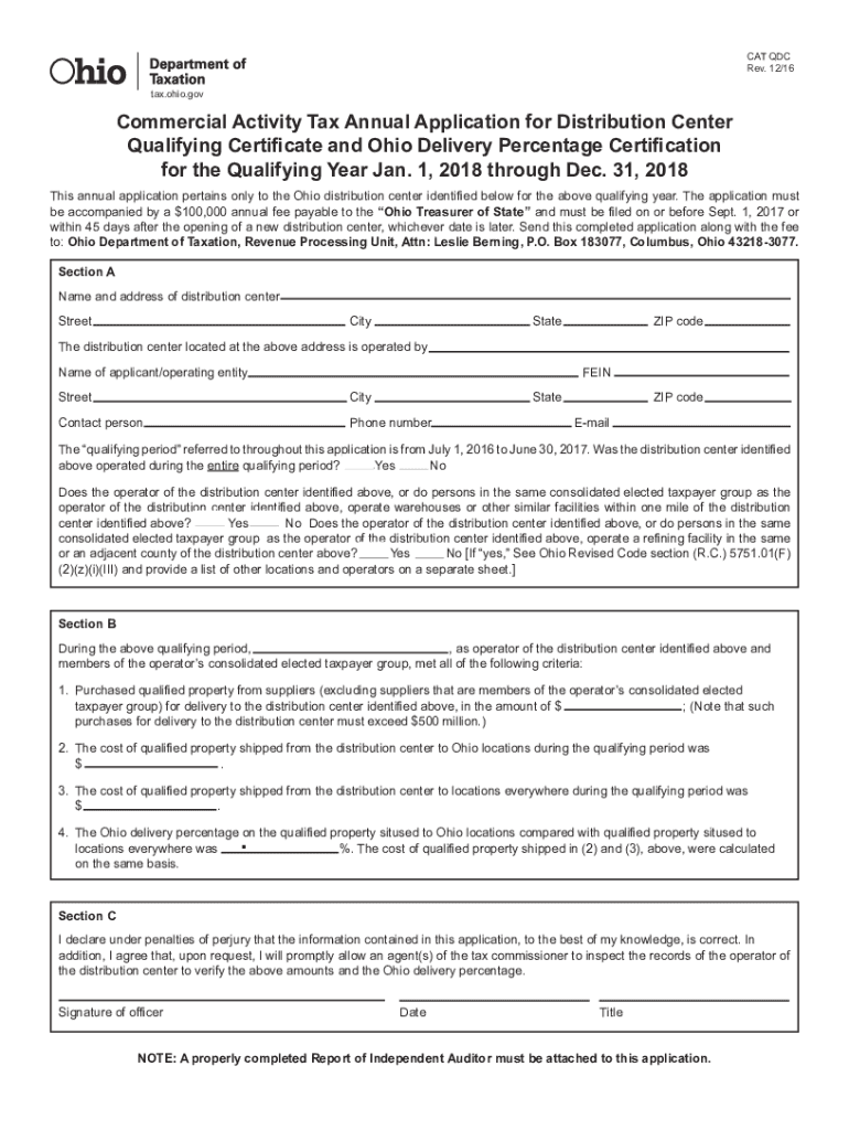 Reset Form CAT ADC Rev. 12/16 tax. Ohio.noncommercial Activity Tax Annual Application for Distribution Center Qualifying Certificate and Ohio Delivery Percentage Certification for the Qualifying Year