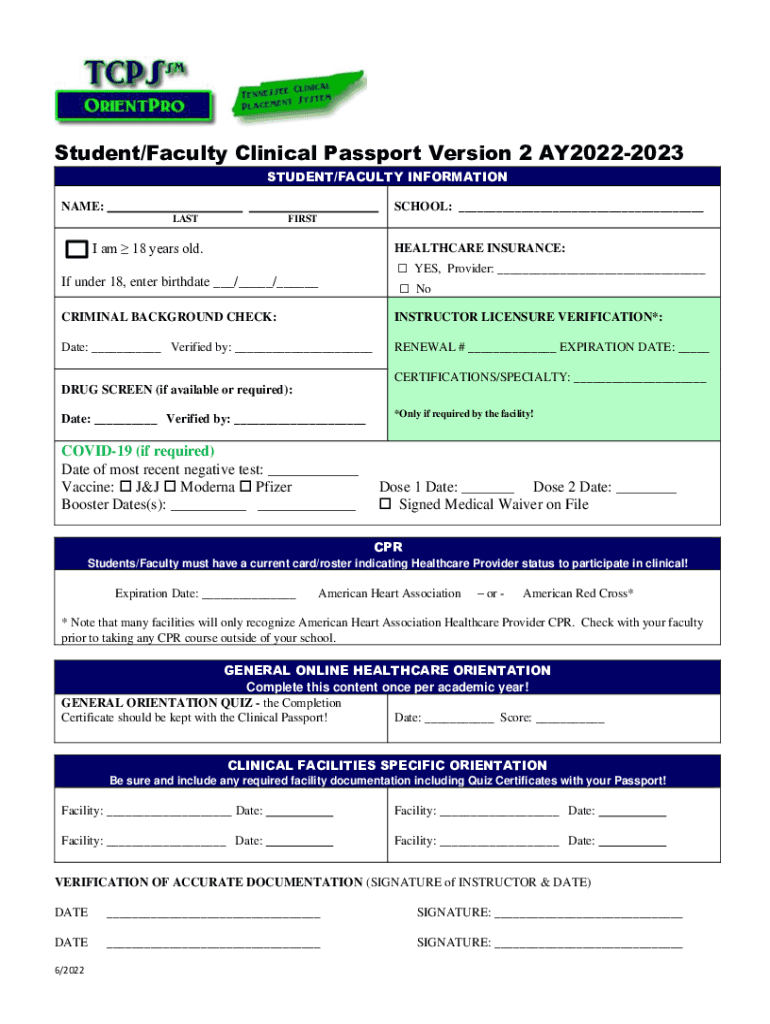 Student/Faculty Clinical Passport Version 2 AY20222023 STUDENT/FACULTY INFORMATION NAME:SCHOOL: ___ LASTFIRSTI am 18 years old. HEALTHCARE INSURANCE:If under 18, enter birthdate ___/___/___ YES, Provider: