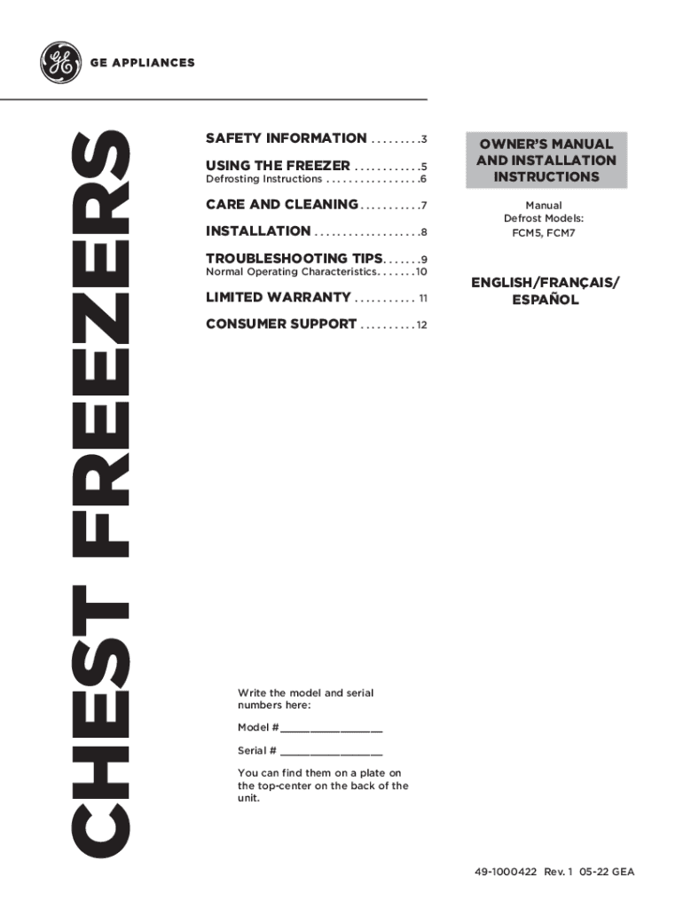 CHEST FREEZERSSAFETY INFORMATION. . . . . . . . .3USING THE FREEZER. . . . . . . . . . . .5 Defrosting Instructions. . . . . . . . . . . . . . . . .6 CARE AND CLEANING. . . . . . . . . . .7 INSTALLATION.