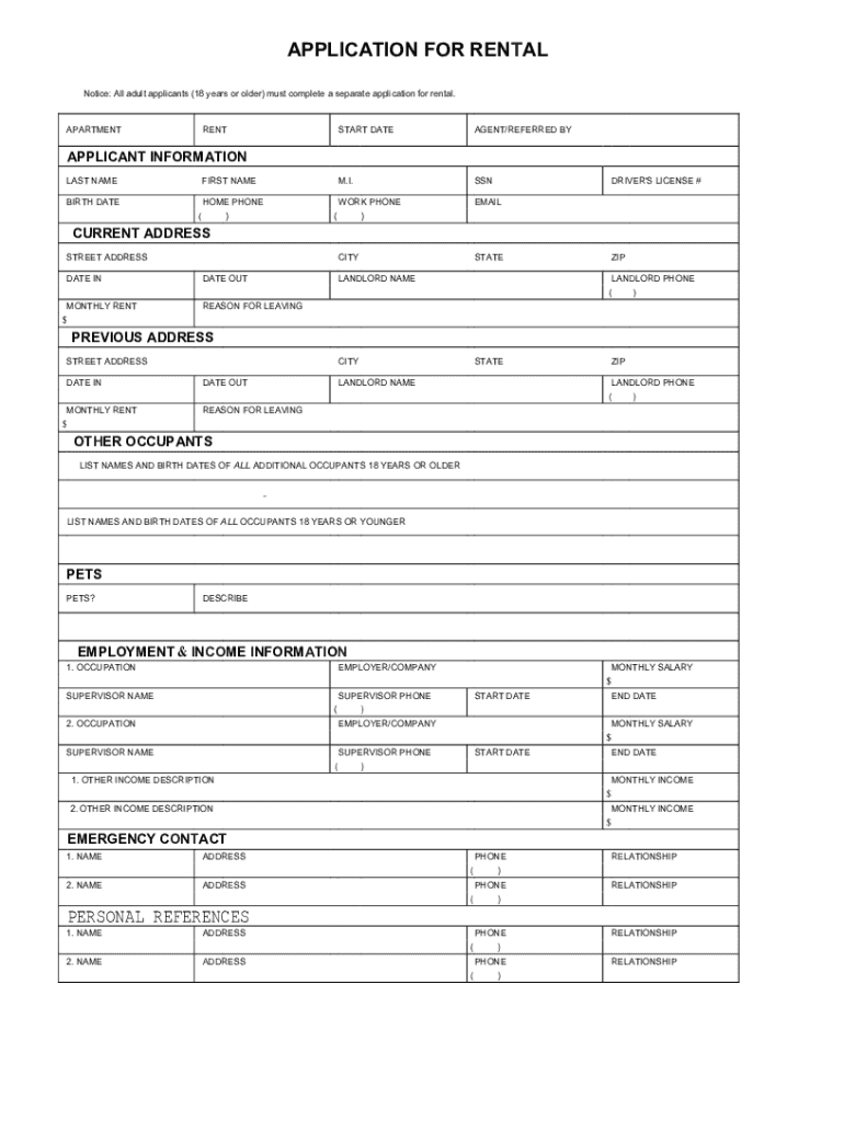 APPLICATION FOR RENTAL Notice: All adult applicants (18 years or older) must complete a separate application for rental.APARTMENTRENTSTART DETERGENT/REFERRED BYM. I.APPLICANT INFORMATION LAST NAMEFIRST