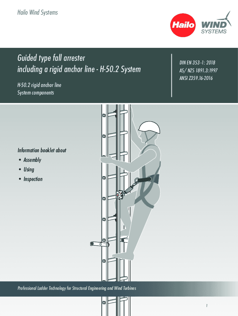 Hail Wind SystemsGuided type fall arrested including a rigid anchor line H50.2 System DIN EN 353 1: 2018 AS/ NHS 1891.3:1997 ANSI Z359.162016H50.2 rigid anchor line System componentsInformation booklet