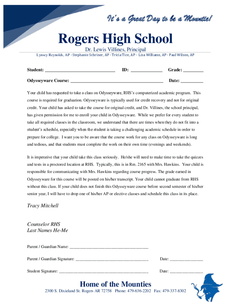 It's a Great Day to be a Mountie! Rogers High School Dr. Lewis Villages, PrincipalLynsey Reynolds, AP Stephanie Shriner, AP Tricia Time, AP Lisa Williams, AP Paul Wilson, Student: ___ID: ___Grade: