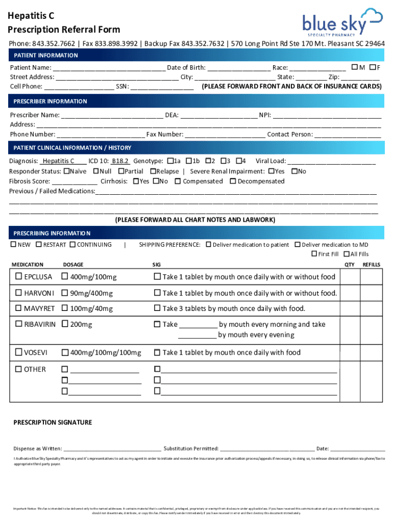 Hepatitis C Prescription Referral Form Phone: 843.352.7662 | Fax 833.898.3992 | Backup Fax 843.352.7632 | 570 Long Point Rd Ste 170 Mt. Pleasant SC 29464 PATIENT INFORMATIONPatient Name: ___ Date