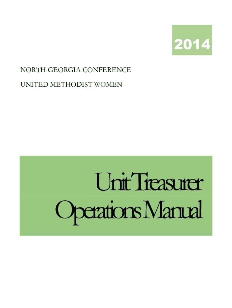 2014 NORTH GEORGIA CONFERENCE UNITED METHODIST WOMENUnitTreasurer OperationsManualUNITED METHODIST WOMENUnit Treasurer Operations Manual Elaine Mathews GUM Conference Treasurer 117 Moody Lane Eaton