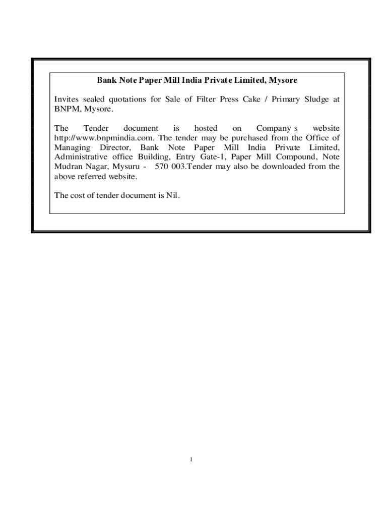 Banknote Paper Mill India Private Limited, Mysore Invites sealed quotations for Sale of Filter Press Cake / Primary Sludge at BNP, Mysore. The Tender document is hosted on Companies' website http://www.bnpmindia.com.
