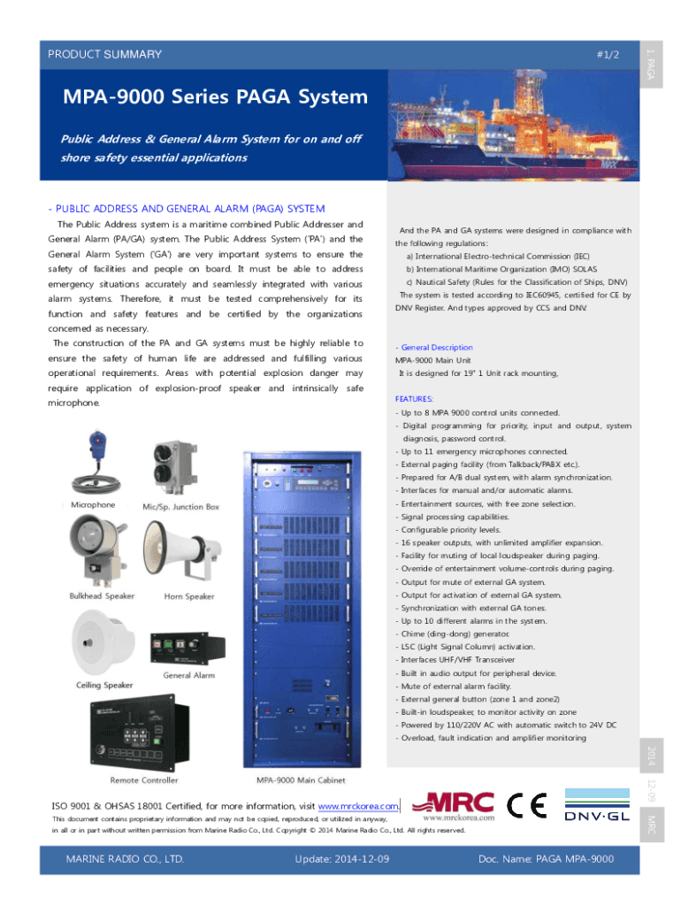 #1/2 #2/21. PAGAPRODUCT SUMMARYMPA9000 Series PAGE System Public Address & General Alarm System for on and offshore safety essential applications PUBLIC ADDRESS AND GENERAL ALARM (PAGE) SYSTEM The