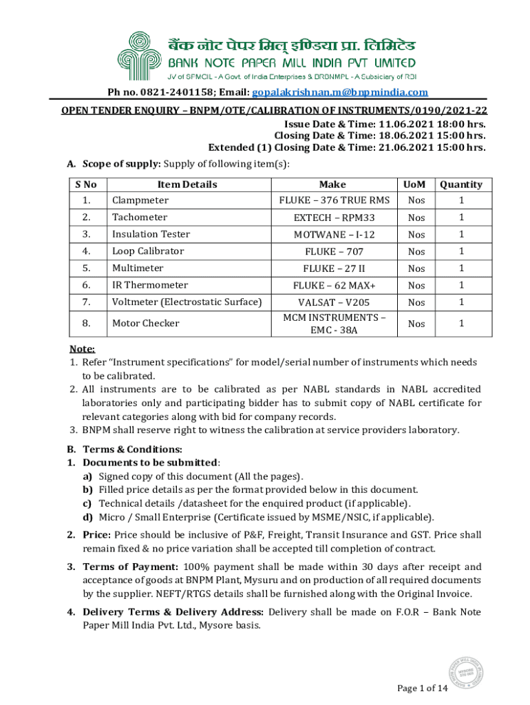 PH no. 08212401158; Email: gopalakrishnan.m@bnpmindia.com OPEN TENDER Inquiry BNP/ONE/CALIBRATION OF INSTRUMENTS/0190/202122 Issue Date & Time: 11.06.2021 18:00 hrs. Closing Date & Time: 18.06.2021
