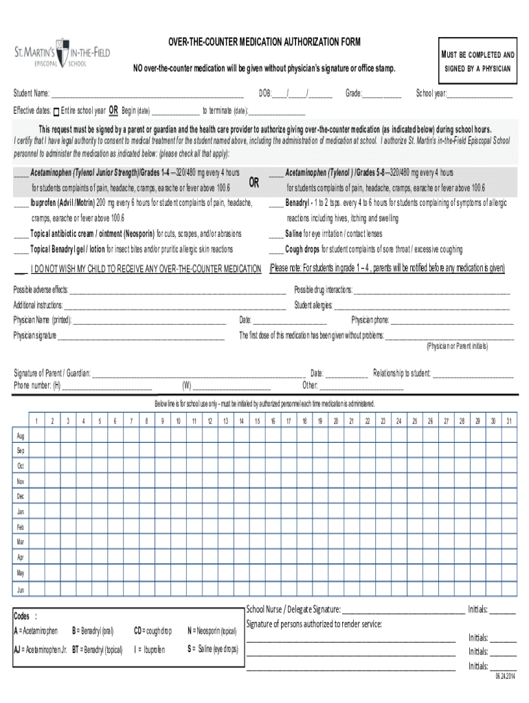 OVERTHECOUNTER MEDICATION AUTHORIZATION FORM MUST BE COMPLETED AND NO overthecounter medication will be given without physicians signature or office stamp. Student Name: ___DOB:___/___/___SIGNED BY