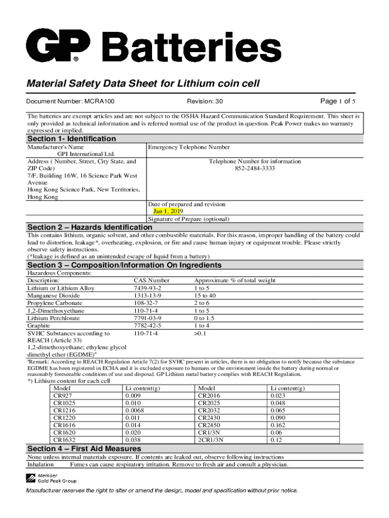 Get the free Material Safety Data Sheet for Lithium coin cell - GPBM ...