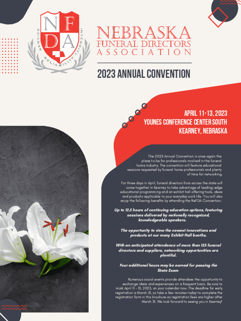 2023 ANNUAL CONVENTION APRIL 1113, 2023 HOUSES CONFERENCE CENTER SOUTHERNER, NEBRASKA The 2023 Annual Convention is once again the place to be for professionals involved in the funeral home industry.