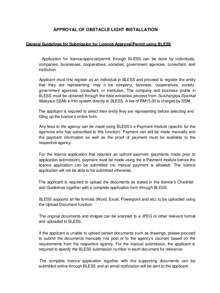 APPROVAL OF OBSTACLE LIGHT INSTALLATION General Guidelines for Submission for License/Approval/Permit using BLESSApplication for license/approval/permit through BLESS can be done by individuals, companies,