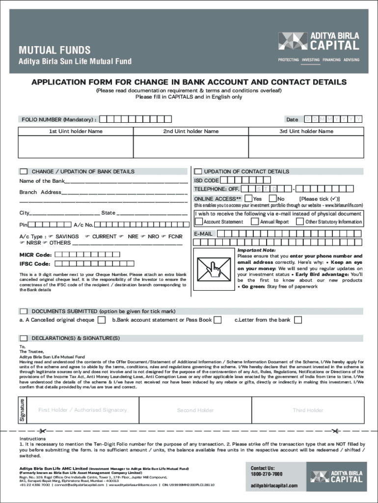 MUTUAL FUNDS Aditya Barley Sun Life Mutual Fund APPLICATION FORM FOR CHANGE IN BANK ACCOUNT AND CONTACT DETAILS (Please read documentation requirement & terms and conditions overleaf) Please fill