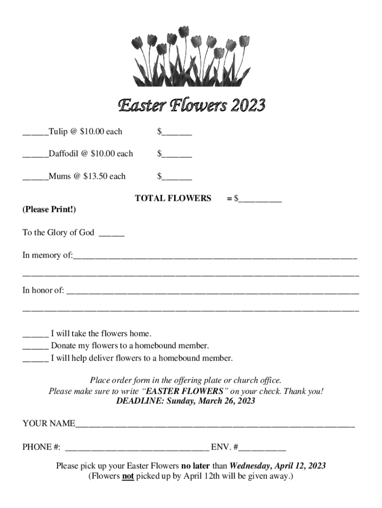 Easter Flowers 2023 ___Tulip @ $10.00 each______Daffodil @ $10.00 each______Sums @ $13.50 each___ TOTAL FLOWERS $___(Please Print!) To the Glory of God ___ In memory of:___ ___ In honor of: ___ ___